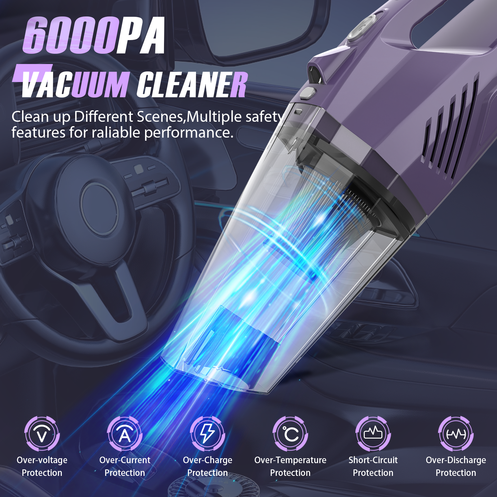 This upgraded handheld car vacuum cleaner has 6000Pa strong suction power, which can easily clean up hair, food residue and dust. Wet&Dry Use, so it's also suitable for kitchen water stains, coffee stains and more. Equipped with LED light, allowing you to clean easily in dark corners or at night. Provides temperature, short circuit and other protection to ensure the device safety. 2.5-3H fully charged, can last for 20-30 mins. Cordless design, 1.5 lbs, lightweight and easy to use, suitable for many spaces such as home and car. Choose our handheld car vacuum cleaner to make cleaning easy and efficient.