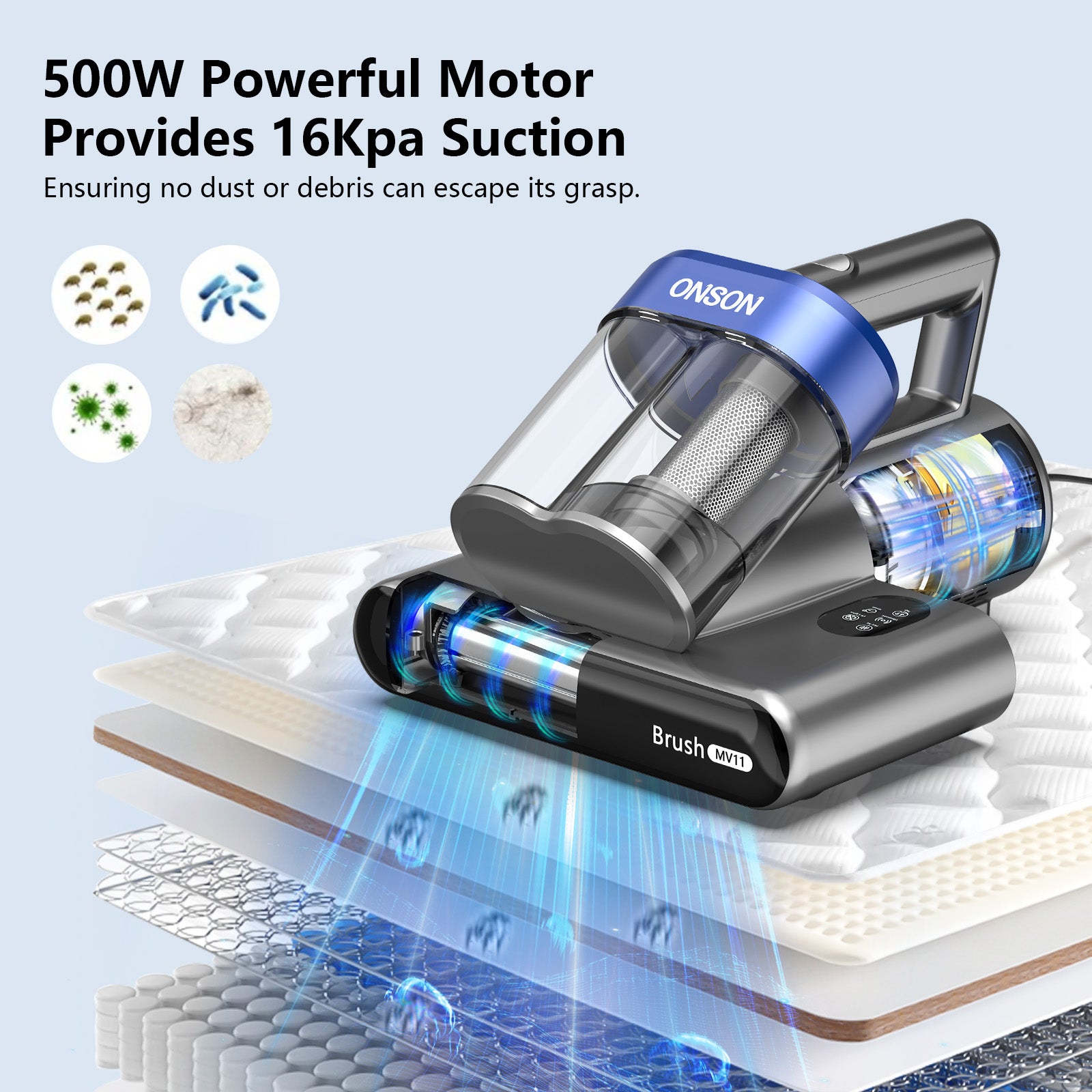 ONSON 16Kpa Mattress Vacuum Cleaner – 3 Filters, Dual Speed & UV Light for Deep Cleaning Beds & Sofas