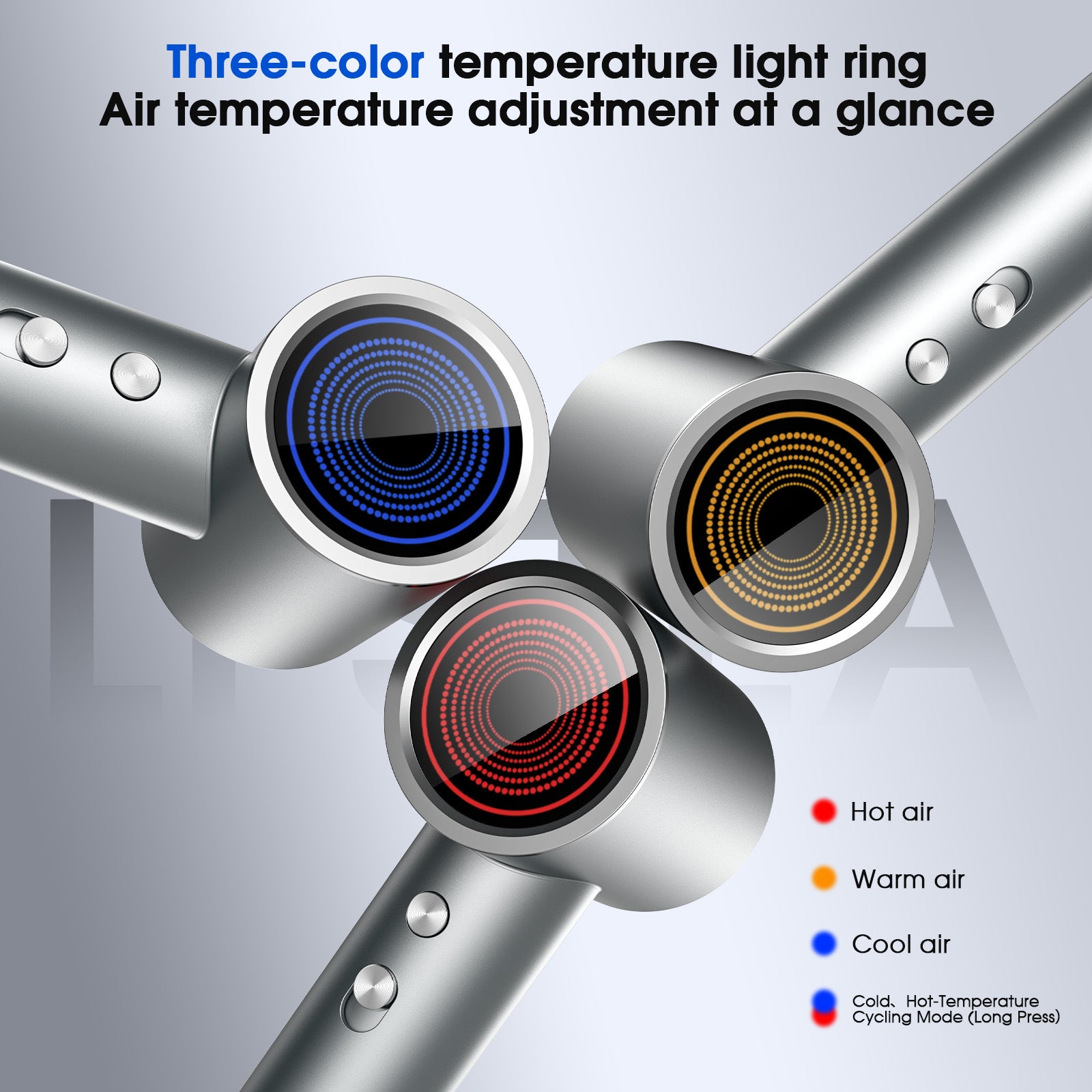 【Intelligent Temperature Control】 The hair dryer features an innovative LED ring design that displays different modes: red for hot air, orange for warm air, and green for cold air. A long press alternates between hot, warm and cold air, making it ideal for all hair types including curly, thick and fine hair.