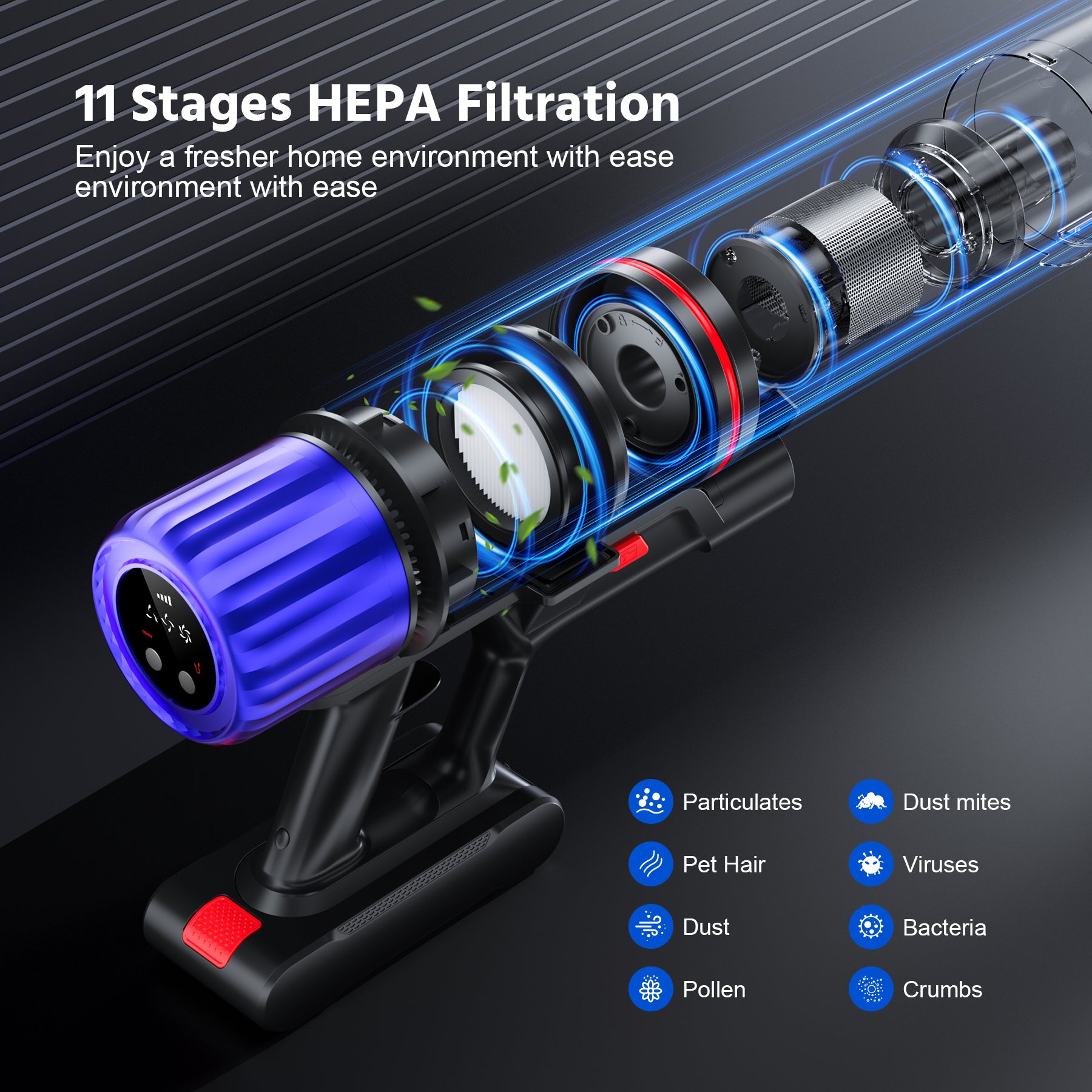 11-STAGE HEPA FILTRATION: The new multi-stage filtration system captures fine dust and allergens to ensure the release of fresh, clean air. This cordless stick vacuum provides a healthier environment for the whole family!