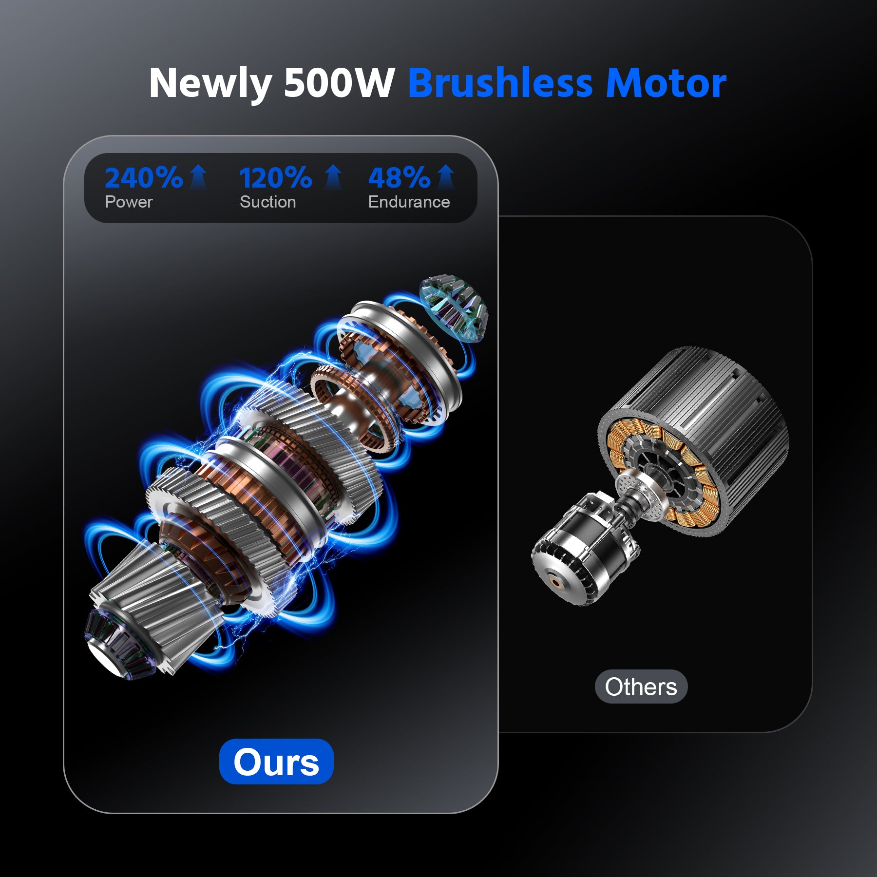 The Teendow Cordless Vacuum Cleaner is an efficient cleaning tool designed for homes with pets. It effectively removes dust and debris from carpets and floors as well as pet hair. Equipped with a powerful 500W brushless motor that spins up to 90,000 RPM, it can easily handle a variety of household cleaning tasks. Three speeds and a 50-minute battery life make cleaning large spaces more efficient.The 11-stage HEPA filtration system ensures clean air and a healthy environment for your family. Extra-long hose and versatile accessories meet a wide range of cleaning scenarios, and the handle touch screen operation is simple and intuitive.
