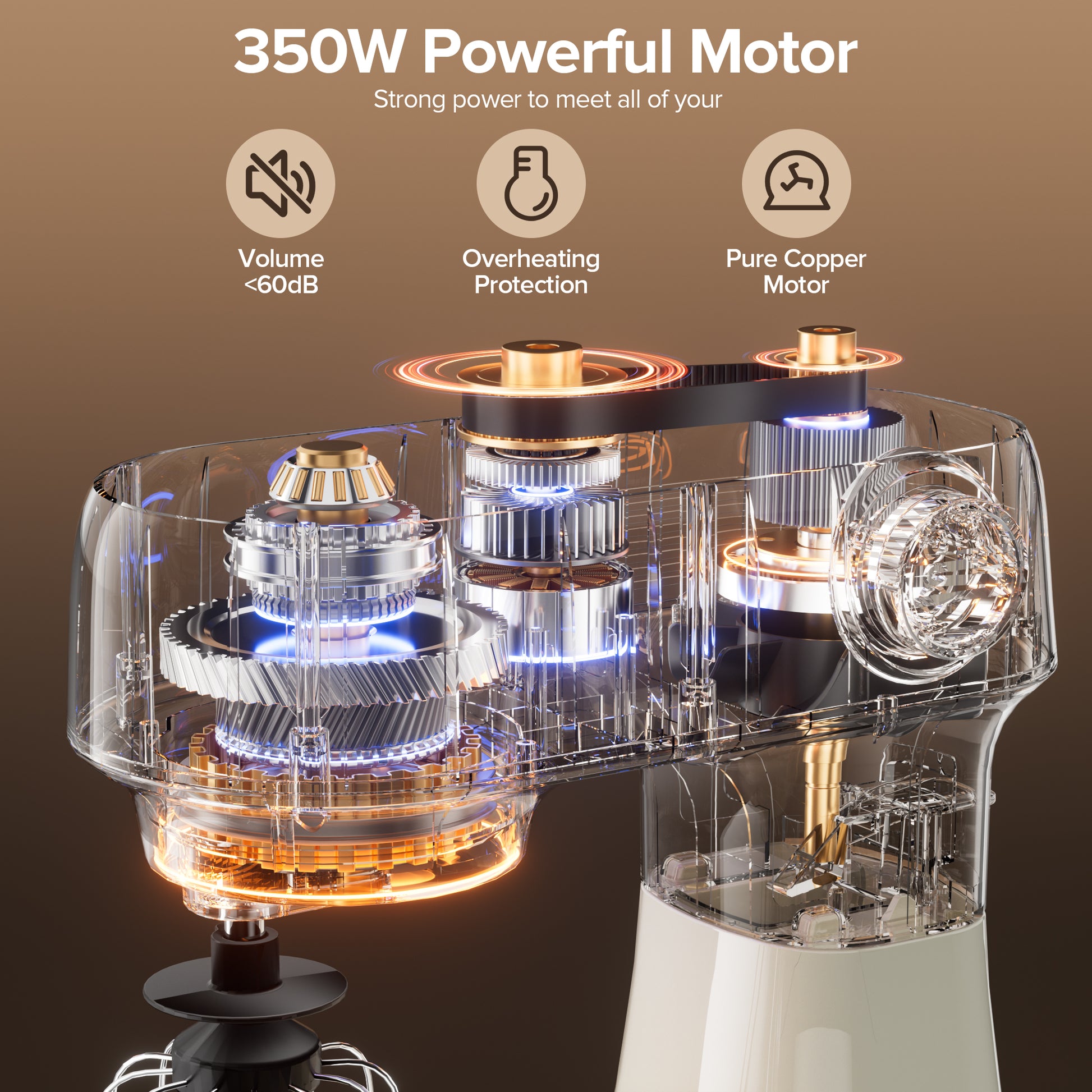 ✅Powerful 350W Copper Motor — Delivers consistent mixing performance for heavy doughs and batters with low noise and long-lasting durability.