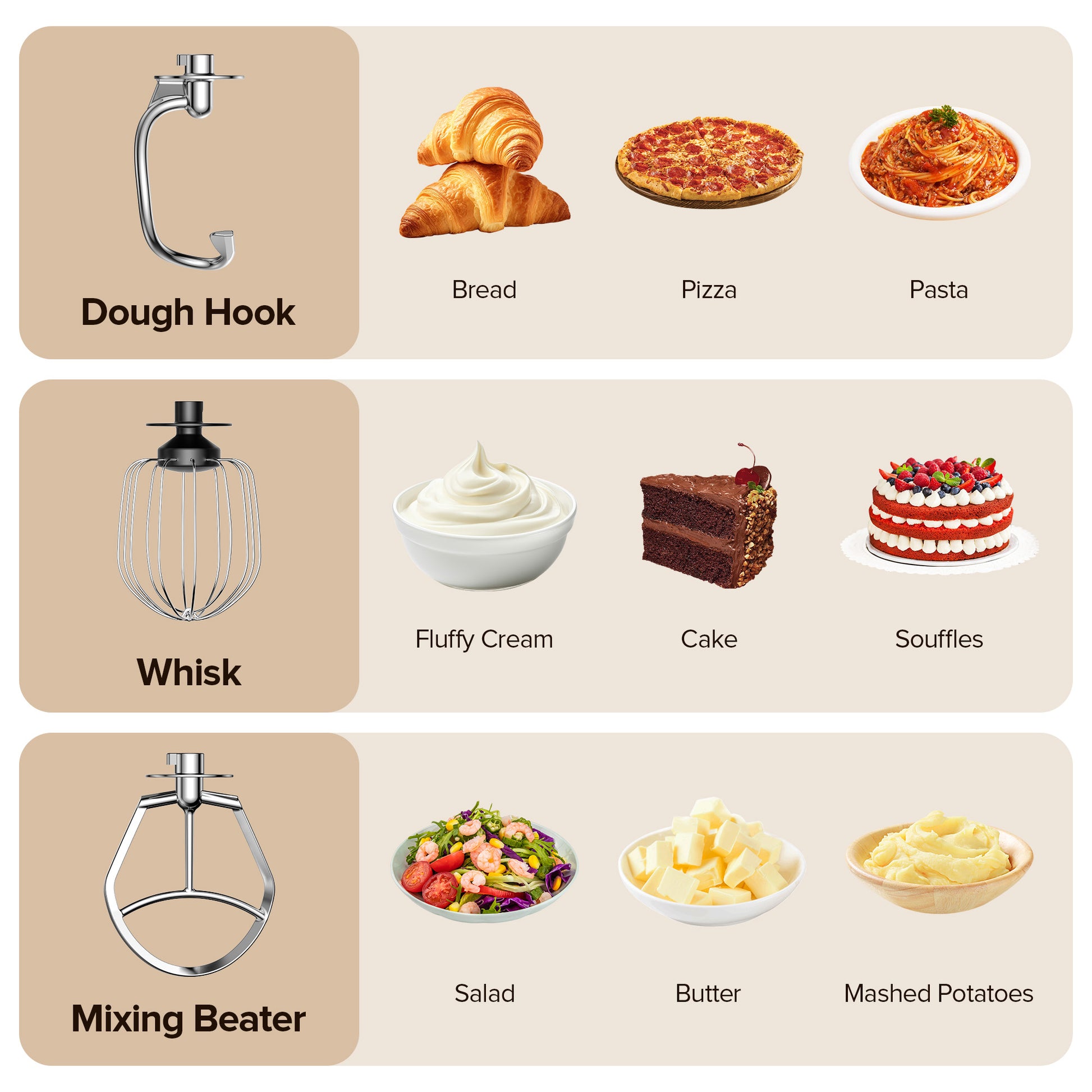 ✅Versatile Attachments Included — Comes with dough hook, whisk, beater, and egg white separator to meet all your baking and cooking needs.